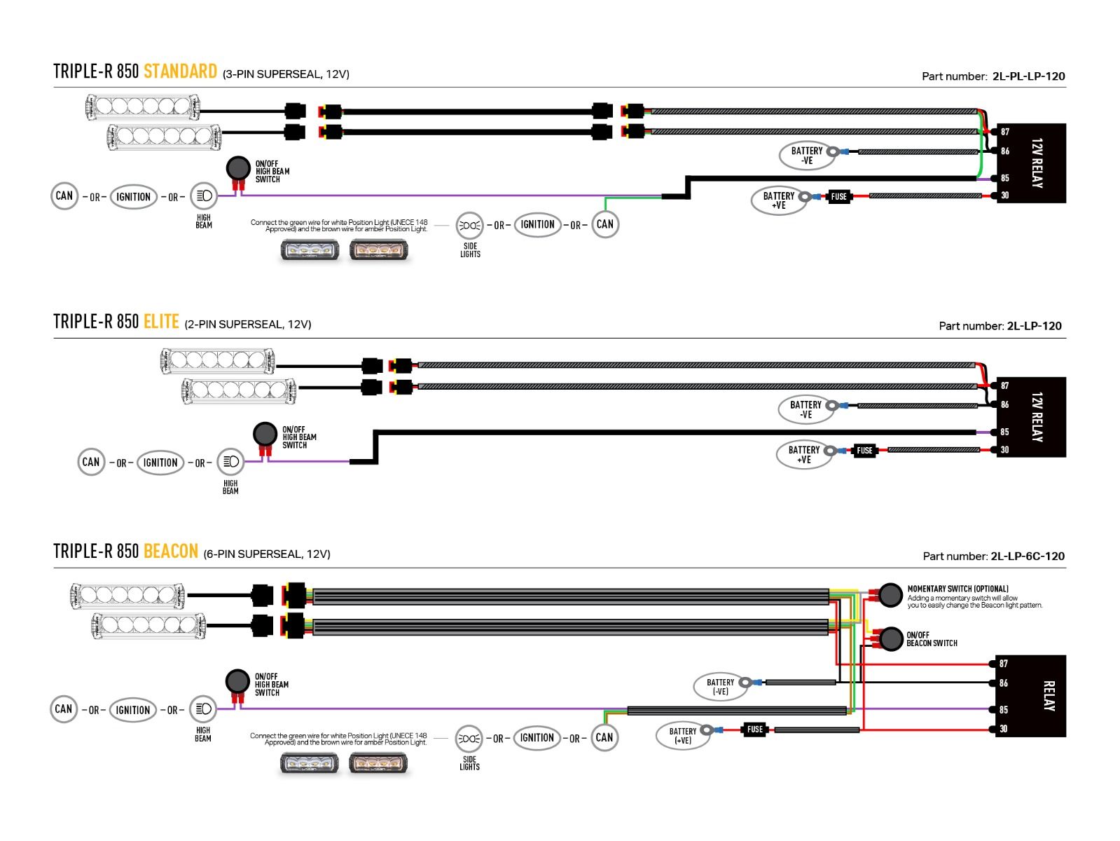 Elke set bevat een paar Triple-R 850 High Performance LED-rijlichten, verkrijgbaar in drie varianten om aan verschillende rijbehoeften te voldoen. De Standard is een veelzijdige alleskunner en biedt een uitgebalanceerd lichtbundelpatroon met uitstekende afstand en spreiding, plus geïntegreerde positielichtfunctie. De Beacon-variant is ontworpen voor veelzijdigheid en heeft een geïntegreerd oranje baken en positielichtfunctie, samen met geavanceerde functies zoals flash-to-dim en welkomstmodus. Voor maximale prestaties levert de Elite superieure optica en een groter bereik voor serieus rijden in het donker.